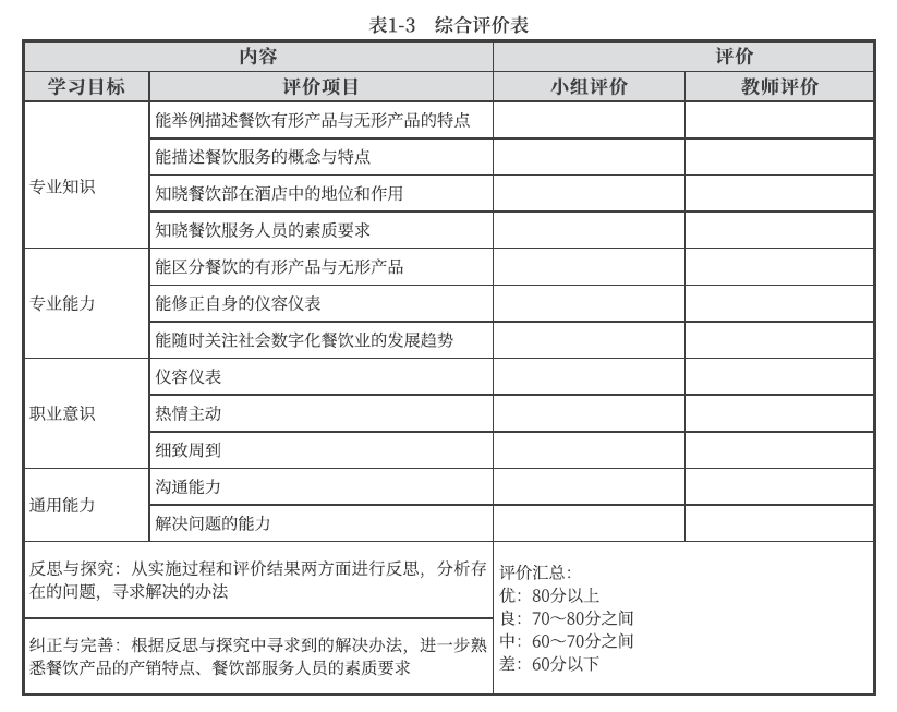 综合评价包括小组之间的互评和教师对各小组工作的系统评价。综合评价见表1-3。