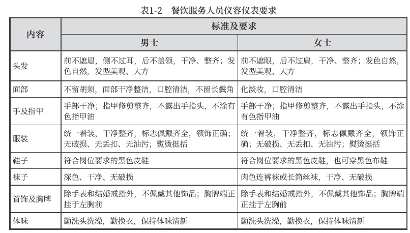 餐饮从业人员应将行业的要求作为习惯来培养。主要表现在礼貌、守时、吃苦耐劳、培 养职业服务、注重个人仪容仪表等习惯。餐饮服务人员仪容仪表要求见表1-2。