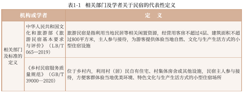 近年来, 随着乡村旅游的快速发展, 乡村住宿业态的类型也在不断创新, 出现了各种类型和级别的农家乐、 客栈和农庄等民宿形式, 经营者来自不同的行业, 有着不同的管理方式和商业模式。 所以, 这些遍布乡村的住宿业态不能用单一的概念来定义。 不同机构或学者对民宿的定义如表1-1所示。