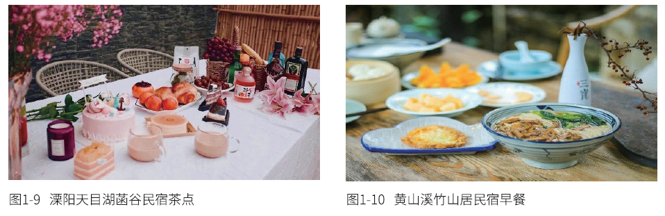 民宿提供的餐饮服务主要包括早餐、茶点、订餐(午、晚餐)或者个性化餐饮增值服 务。多数民宿客人以民宿为据点,在周边进行全天的旅游活动,在民宿的主要停留时间为夜 间歇息及早餐享用时段。相较于酒店的餐饮部,民宿则将餐饭重心几乎都倾注在早餐上。餐 饮服务相较于客房服务,更直观、动态地展现了民宿经营者的服务理念,即参与感与互动感 更强。除早餐外,一般民宿还提供茶点服务,包括前台等候区的糖果、饮品,餐饮区的下午 茶,客房内的睡前小点等。客人可根据自身的喜好选择西式的下午茶或中式的功夫茶,搭配 手工小点心等,既能独自消遣,又可同他人分享乐趣。部分民宿提供午餐及晚餐服务,但必 须提前预订以便于采购食材。有的民宿提供炊具、冰箱等厨房设施设备,由客人自行烹调。 随着现代人对健康的追求,在饮食方面愈来愈关注食材的新鲜程度及烹饪方法,因此部分民 宿会提供营养早餐、减肥餐、老年餐等个性化餐饮服务(见图1-9、图1-10)。