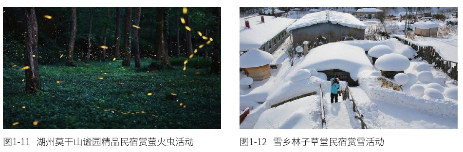 这种活动常常依托民宿周边独特的自然环境展开,让客人能够置 身于当地独特的生态空间中,实现人与环境交流的休闲放松。例如, 湖州莫干山滥园精品民宿策划的观赏萤火虫活动(见图1-11),冬季 雪乡民宿利用当地雪景设计的一系列赏雪活动(见图1-12)。