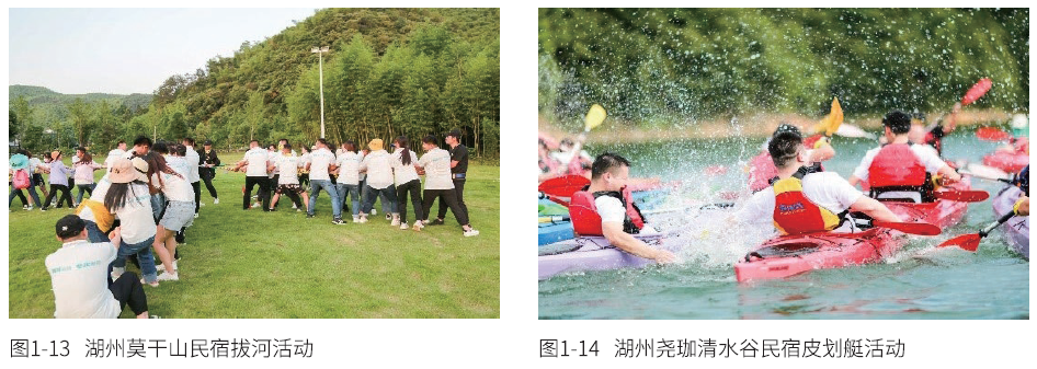 有些民宿在设计活动时常常将运动休闲活动植入民宿主题,让客人在住宿期间能够参 与到运动休闲活动中,享受身体的放松和精神的愉悦。例如,为加强民宿客人的住宿参与 感,民宿会定期组织一系列的休闲运动竞赛(如拔河比赛、皮划艇竞赛等),让客人参与 其中(见图1-13、图1-14)。