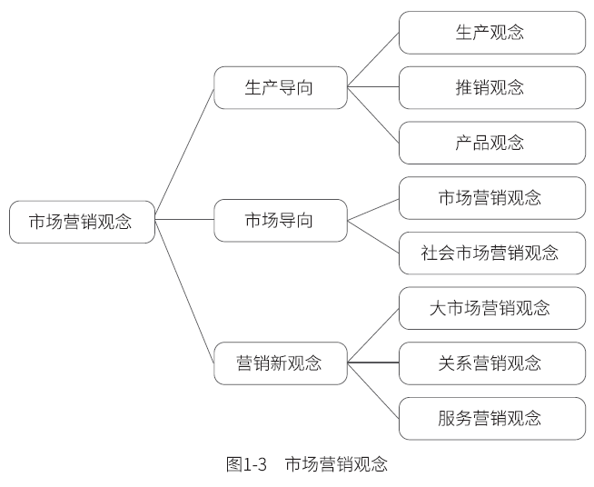 传统的以生产为导向的市场营销观念包括生产观念、推销观念、产品观念;现代的以 市场为导向的市场营销观念包括市场营销观念、社会市场营销观念;市场营销新观念包括 大市场营销观念、关系营销观念、服务营销观念。本节将具体阐述各阶段不同的市场营销 观念(见图1 - 3)。