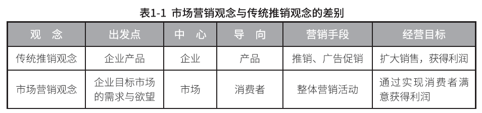 市场营销观念的出现,推动了酒店经营观念的根本性变革,实现了消费者满意与酒店 长期盈利的整合。市场营销观念是一种新型市场营销理念,与传统的推销观念有很大的差 别(见表1-1)。