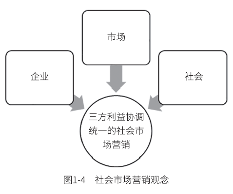 社会营销观念是在市场营销观念基础 上对其进行的修正和发展,该观念认为, 企业在进行市场营销及组织各项经营活动 时必须承担社会责任,不仅要满足消费者 的需求,还要重视社会利益的实现,使 消费者需求、消费者短期利益、消费者长 期利益与社会利益达到最佳搭配,从而实 现企业、市场、社会三方利益的协调统一 (见图1-4)。