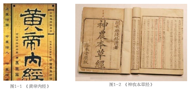 随着社会的发展,到了西周至秦汉时期,由于社会生产力有了较大的提高,促进了科 学文化的发展。饮食保健也在长期实践经验的积累上,逐步开始从理论上加以总结。这一时 期,随着本草学的发展、中医理论体系的初步形成和辨证施治医疗实践原则的确立等,中国 饮食保健学理论体系的雏形也初步显现,为此后中国饮食保健学的发展奠定了基础,是中国 饮食保健学发展史上非常重要的一个时期。此外,在当时的医政制度中还出现了专门的“食 医”,对推动饮食保健学的发展起到了积极的作用。这一时期的代表性著作主要有《黄帝内 经》(见图1-1)、《神农本草经》(见图1-2)和《伤寒杂病论》。