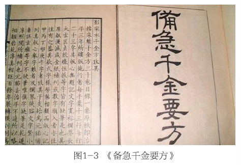 进一步丰富了中国饮食保健学的内容。与此同 时,在理论方面,食疗开始逐渐从各门学科中分 化出来,出现了专门论述食疗的专卷以及在本草 学中出现了系统总结食疗食物的专门著作,反映 了对食疗的研究已达到相当的水平,并标志着 食疗专门研究的开始。这一时期的主要著作 有《备急千金要方》(见图1- 3)、《食疗本 草》、《食医心鉴》等。